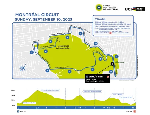 Het parcours is hetzelfde als in alle andere jaren: in totaal moeten er achttien rondes verreden worden in Montrea. Voor de snelle rekenaars onder ons: dat is 269 per ronde, verdeeld over vier beklimmingen: de Cote de Camillien-Houde is daarvan de eerste en meteen ook zwaarste. Deze heuvel is 1,8 kilometer lang en heeft een gemiddeld stijgingspercentage van acht procent.