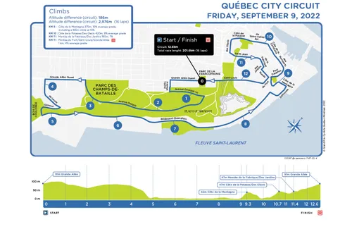 Starten en finishen doen we op de Grande Allée, maar het gros van de koers wordt afgewerkt rondom het Parc des Champs-de-Bataille. Qua lastigheidsgraad zit het hem vooral in deel twee van het rondje, met de Cote de la Montagne (375 meter aan 10 procent), Cote de la Polasse (420 meter aan 9 procent) en Montee de la Fabrique (190 meter aan 7 procent) als obstakels.