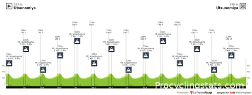 Japan Cup bestaat uit 14 rondjes door en rond de stad Utsunomiya. De rondjes zijn ieder iets meer dan tien kilometer lang. In 144 kilometer moeten de renners ruim 2500 hoogtemeters overbruggen. Dit komt doordat Mount Kogashiyama in het parcours is opgenomen. De heuvel is officieel vijf kilometer lang en stijgt met slechts 3,4 procent gemiddeld, maar dit is een vertekend cijfer. De laatste 1,4 kilometer gaan namelijk met 6,9 procent omhoog. Na de klim is het dalen richting de finishlijn. Deze streep ligt ongeveer halverwege de klim, vlak voordat het echt steil wordt.