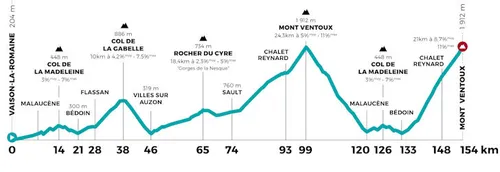 De naam van deze wedstrijd zegt het al: het draait voornamelijk om de 'Ventoux', die tweemaal beklommen moet worden. Maar het voorgerecht mag er ook zeker zijn, met enkele beklimmingen die voor extra lading zorgen.