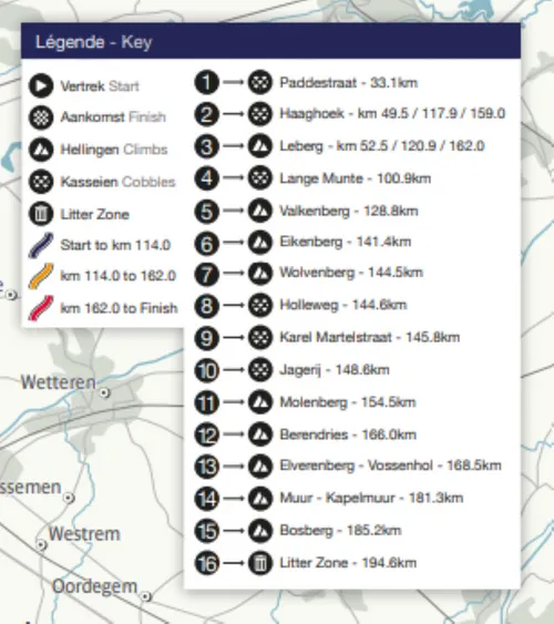 Halfweg koers komen we in de Vlaamse Ardennen aan, met achtereenvolgens de Lange Munte,, Leberg, en Valkenbeg. Met nog circa vijftig kilometer te gaan is de combi Eikenberg/Wolvenberg vaak het beginpunt van de finale, temeer de kasseistroken van Holleweg en Kerkgate/Jagerij er vrij snel op volgen en we intussen ook het laatste koersuur naderen.