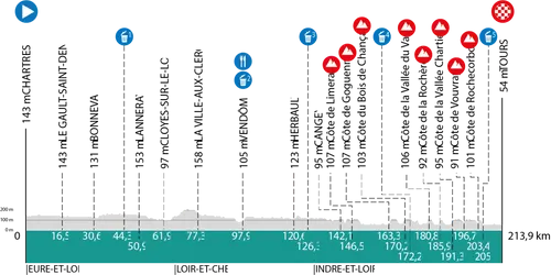 Vanuit Chartres, gelegen in het departement Eure-et-Loir, trekken we in zuidelijke richting naar Tours. wedstrijd is opgedeeld in twee stukken: de eerste 140 kilometer zijn overwegend vlak en rechttoe rechtaan, maar in de laatste 75 wordt dit ruimschoots goedgemaakt met een hoop stroken waarop het verschil gemaakt kan worden. En dan hebben we het niet alleen over de Chemins des Vignes, zoals de wijnpaden genoemd worden in deze regio van Frankrijk.