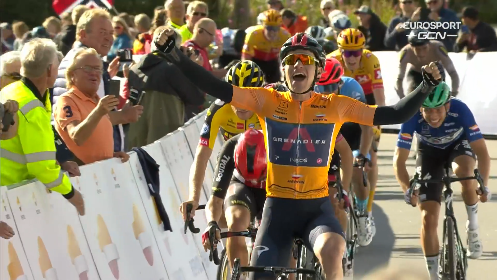 Ronde van Noorwegen. Niemand minder dan Filippo Ganna verpestte dat feestje, hij maakte met zijn hoge tempo een eind aan de droom van de vluchters. Even brak het peloton in allerlei stukken op de laatste heuvel, maar dat was maar van korte duur. Alles kwam terug samen, en in de pelotonsprint wist de succesvolle baanrenner Matthew Walls de overwinning naar zich toe te trekken.
