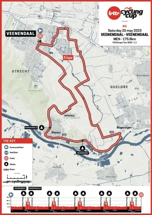 In vergelijking met 2022 heeft de organisatie de route twintig kilometer ingekort én is de aanloop eruit gehaald. De aanwezige renners werken vijf plaatselijke rondes af, wat het totaal laat uitkomen op 175,8 kilometer. Het parcours is nagenoeg vlak, hoe kan het ook anders in Nederland, maar toch zitten er twee kuitenbijters in ieder rondje. De Grebbeberg en het Paardenveld gaan niet voor grootse tijdsverschillen zorgen, al zullen de sprinters het zeker even voelen.