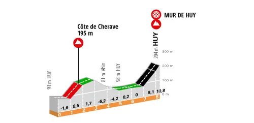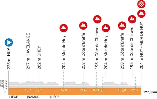 Het rondje start (en eindigt) met de Muur van Hoei, maar dat is niet de enige beklimming. Tussendoor wachten namelijk ook de Côte d'Ereffe en de Côte de Cherave. Qua stijging zijn deze klimmetjes echter niet te vergelijken met de 'Muur'. De slotklim begint aan ongeveer 5 procent en loopt langzaam maar zeker op naar maar liefst 19 procent! Het einde vlakt lichtelijk af, maar het wordt zoals altijd een gevecht tussen de beste klimsters en punchers!
