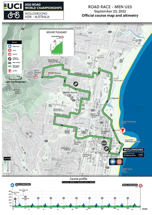 De junioren zullen acht rondes doen, de beloften mogen twee rondjes langer afwerken. In totaal is dit goed voor respectievelijk 135,6 en 169,8 kilometer, verdeeld over de technische rondjes in het oosten van Australië. De Mount Pleasant ligt overigens in het midden van dit rondje, met zijn lengte van 1,1 kilometer en gemiddeld stijgingspercentage van 7,7 procent. Dit loopt op tot maximaal 14 procent.