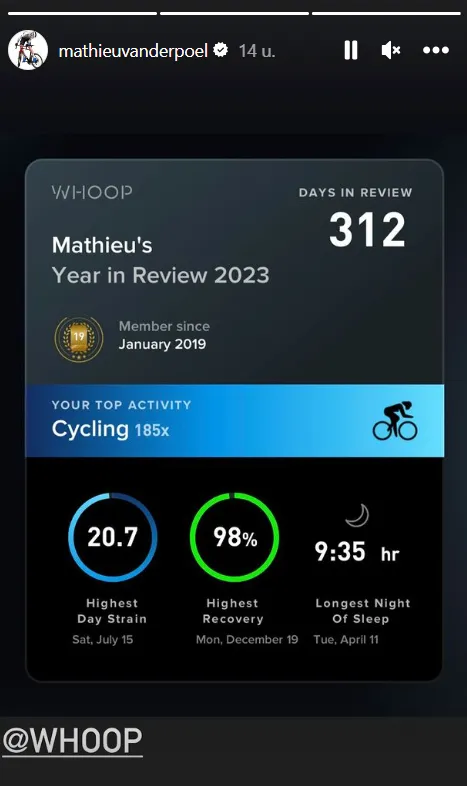 Instagram een jaaroverzicht getoond van zijn Whoop-trainingsdata. De Nederlander van Alpecin-Deceuninck kende zijn beste herstel deze week, in het weekeinde na zijn openingscross in Herentals, terwijl zijn langste nachtrust ook geen verrassing zal zijn: dat was op dinsdag 11 april, na het winnen van
