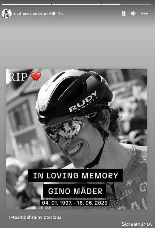 rond half één bekend dat Mäder overleden is na zijn val in het ravijn een dag eerder. 'Het is met diep verdriet dat we moeten meedelen dat Gino op vrijdag 16 juni overleden is aan de gevolgen van een zware val in de vijfde rit van de Ronde van Zwitserland',