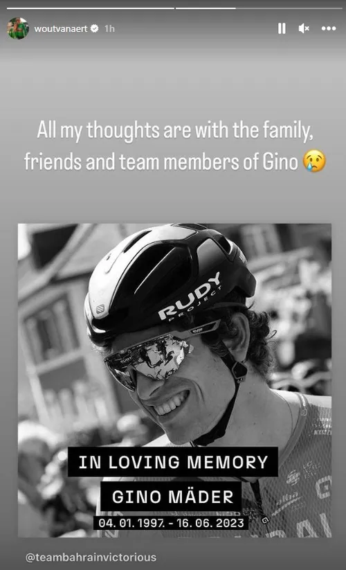 'Ik kan het niet geloven, maar het is echt gebeurd', schrijft Wout Poels, die al jaren in de ploeg reed bij Mäder. 'Het is onwerkelijk. Ik kan alleen maar huilen', zei hij donderdag na de etappe al. Of zoals Alberto Bettiol het vrijdagavond laat verwoordde: 'Rust in vrede, Gino. Al mijn gedachten zijn bij zijn familie. We zijn een broer verloren, één van de mooiste mensen in het peloton, supergetalenteerd, stil en geliefd. Het leven is soms zo oneerlijk, we houden je in ons hart.'