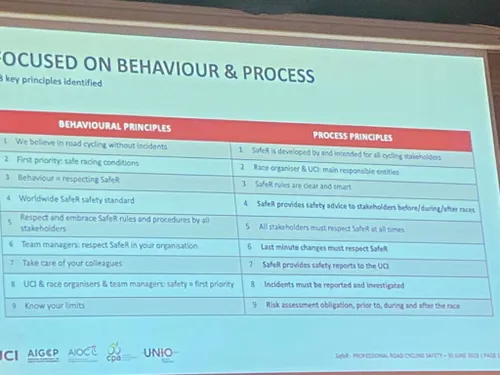 Door achttien regels op te stellen wil SafeR inspelen op zowel het gedrag als het proces, waar in principe alle stakeholders zich aan moeten gaan houden. Enkele voorbeelden die aangehaald werden: 'Motoren die voor het peloton rijden snijden bochten af, waardoor er alsnog grind op de wegen komt. Dan komt het risico dus uit de karavaan zelf. Datzelfde geldt voor die bewuste crash in de Ronde van Vlaanderen, waarbij de berm wordt opgezocht. Als een weg vijf meter is, is die niet vijf meter tien breed.'